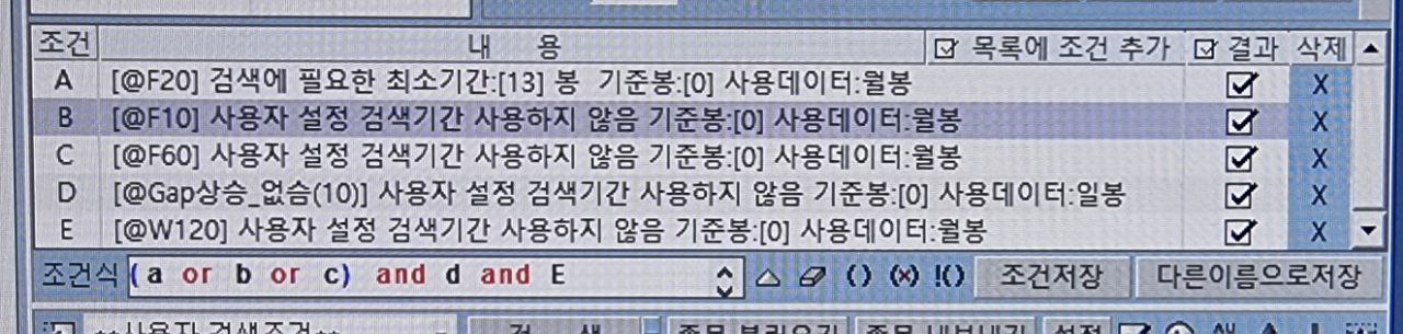 검색 조건이 둘 이상인 경우에는 '검색결과값'을 볼 수는 없고 각각의 조건이 만족했는지를 O, X로 보여줍니다.(좌우 스크롤로 화면 맨 우측으로 이동하면 확인 가능합니다.) 예를 들어 A 조건과 B조건을 or 조건으로 검색했을 경우 둘 중 하나를 만족하면 종목이 검색되게 되는데 이때 각 종목이 A조건을 만족했는지, B조건을 만족했는지 O, X로 표시해서 나타냅니다.