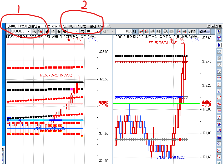 빨간색 동그라미로 표시한것과 같이 한 차트에 2개 이상으로 설정해 놓고 클릭시 번갈아 나타나게 하는 기능.