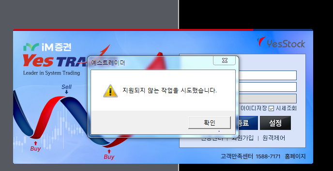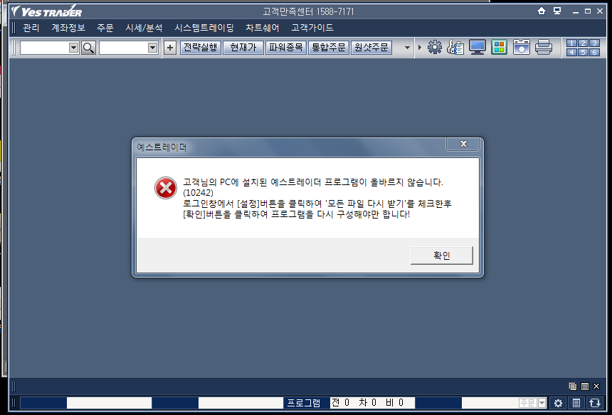 올려주신 내용은 프로그램 업데이트가 정상적으로 처리되지 않아서 발생된 현상으로 보입니다. 해당 현상은 영문 윈도우를 사용하는 등의 특수한 상황에서 발생되는 것으로 보이는데, 해결을 위해서는 저희 예스스탁으로 연락을 부탁드리겠습니다.