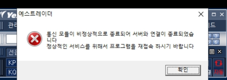 해당 현상은 예스트레이더가 특정 상황에서 통신 접속 프로그램이 종료되면서 발생되는 에러입니다. 해당 현상이 발생될 경우에는 재접속하셔서 사용하셔야 되며, 발생하신 현상이 일반적으로 보고된 적은 없어서 일회성으로 발생된 것인지 계속 발생될 수 있는 현상인지에 대해서는 저희도 아직 파악이 되지 않고 있습니다.