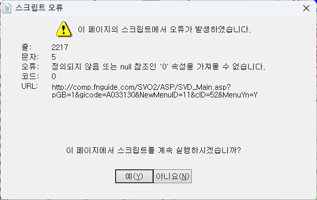 안녕하세요? 예스스탁입니다. 사용하시느 프로그램이 SI증권 예스트레이더가 맞으신지요? 오류 나는 내용을 보니 Fnguide 연결된 곳에서 에러가 나는것 같은데, 예스트레더에서 서비스 하는 내용이 아닙니다. 예스트레이더에서 나오는 오류일 경우 스팟이나 데이터매니저 등에서 외부 재무데이터를 이용하신다면 그 내용을 확인해 보셔야 할것 같습니다. 감사합니다. > 나고수야 님이 쓴 글입니다. > 제목 : 스크립트오류 > 종목변경시 오류납니다 그림참조