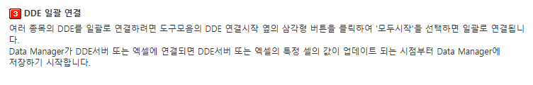DDE를 통해 데이터매니저로 실시간 데이터를 넣는 방법은 타 프로그램과 데이터매니저를 직접 연결하는 방식과 타 프로그램과 데이터매니저 사이에 엑셀프로그램을 통해서 실시간 데이터를 받는 방법이 있습니다. 매뉴얼에 타 프로그램의 DDE를 직접 데이터매니저로 연결해서 사용하는 방법을 예로 올려 놓았는데, 타 프로그램 서비스의 내용을 정확히 알 수 없어서 현재도 이와 같은 방법으로 실식간 DDE를 데이터매니져와 연결해서 쓸 수 있는지는 정확히 알 수 없습니다. 때문에 일반적으로는 타 프로그램의 DDE에서 엑셀로 내보내기 기능을 처리하고, 데이터매니저에서는 엑셀 특정 셀의 값을 라이브로 불러와서 저장하는 방법을 사용합니다.