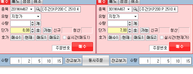 콜과 풋을 동시주문을 내기위한 화면입니다.
