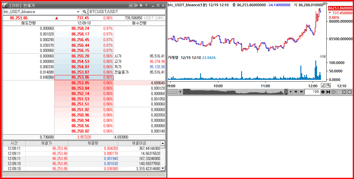 위 현재가 화면 외에도 [화면 3102:코인시세] 내지 [전광판] 등도 API 를 통해 실시간으로 DATA 를 갖고 오도록 함으로써 동일한 효과를 볼 수 있습니다.
