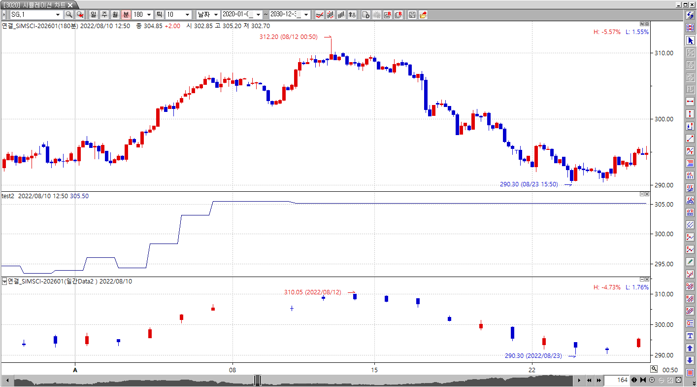 Plot1(data2(C)); 조회시 계속 305.15로 종가가 고정되어 더이상 업데이트 되지 않는 버그가 있습니다.