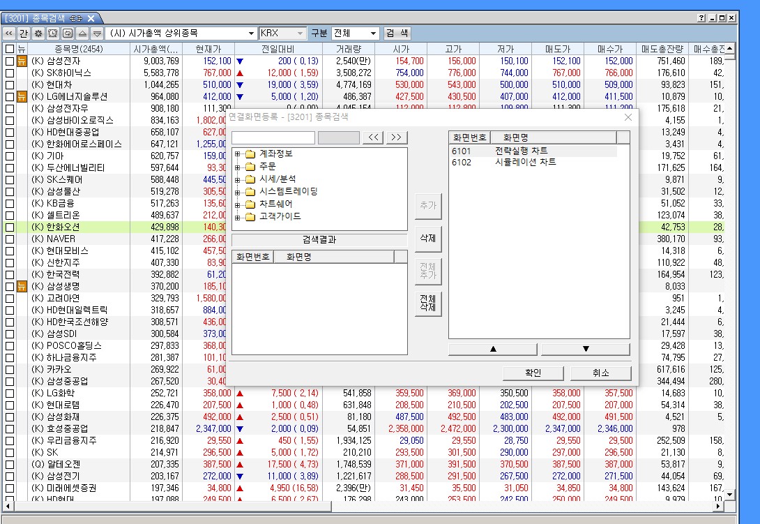 종목검색(3201)화면 시가총액 상위종목에서 종목을 클릭시 전략실행차트 또는 시뮬레이션 차트 로 연결시키는 방법은 무엇인가요.