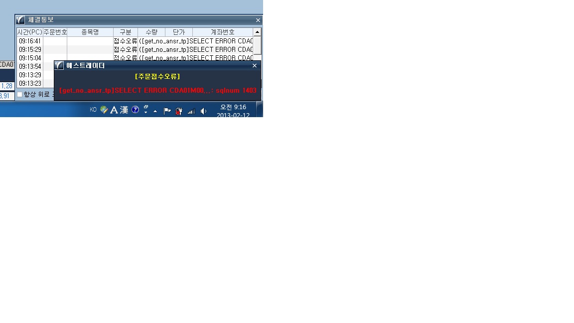 올려주신 오류 메시지로 확인해본 결과 매매하는 종목과 계좌가 서로 달라서 발생되는 문제인 것으로 파악되었습니다. (예를들면 선물거래인데 주식계좌가 선택되어 있는 경우)