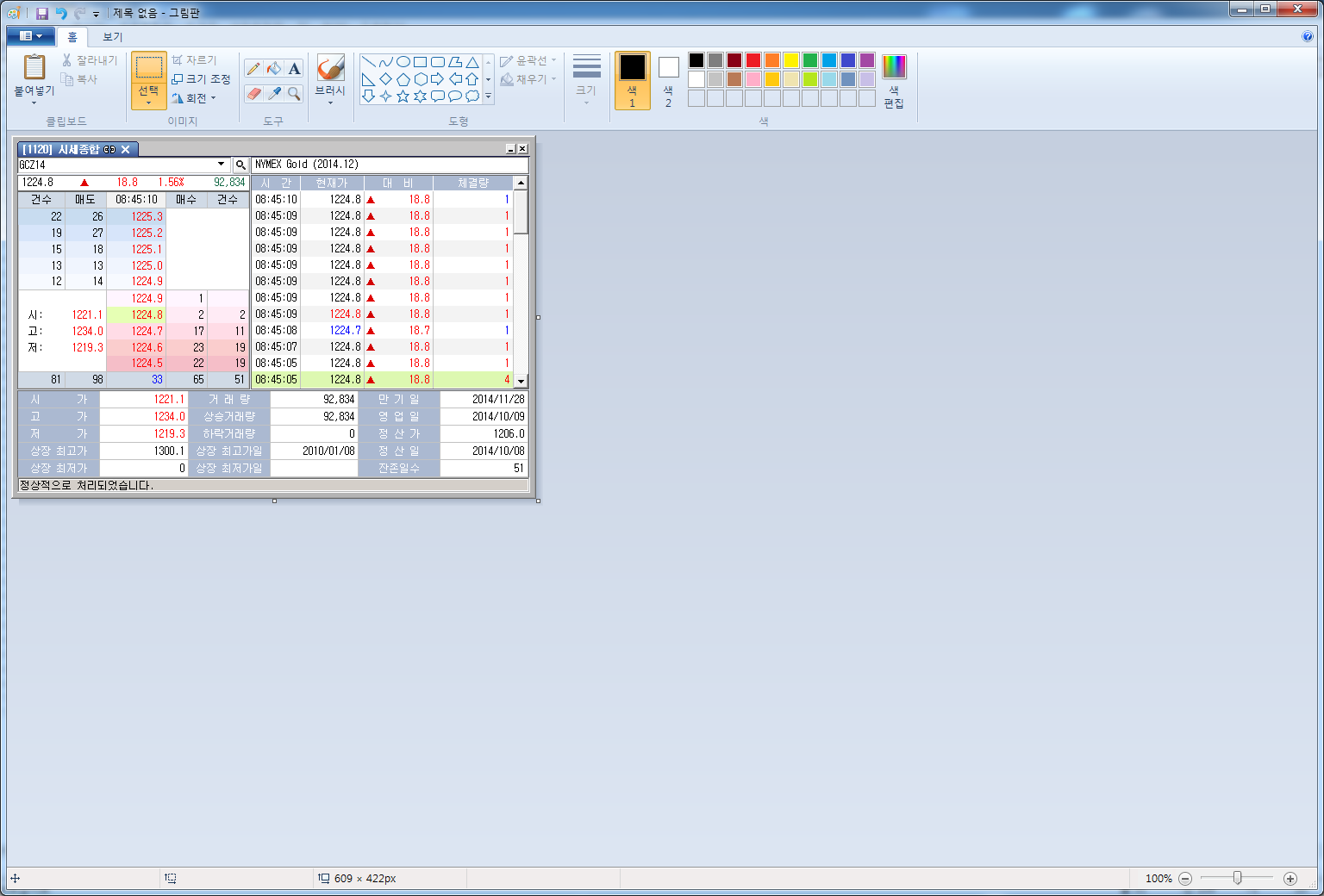 매수 1 호가와 매도 1호가가 동일하게 표시되고, 호가잔량을 서로 상이함