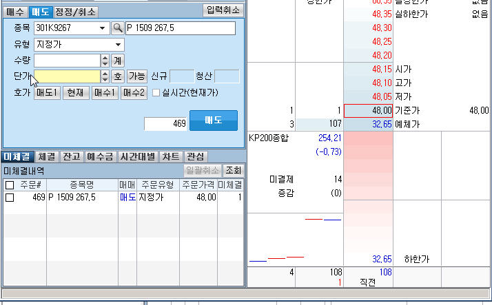 > 제가 오늘 9월물 풋 267.5 에 1계약 매도주문을 넣어봤습니다.