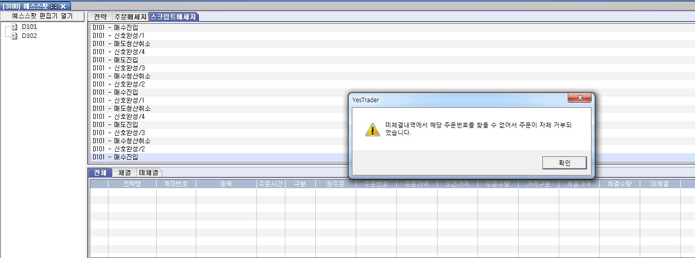 그리고 위 그림과 같이 오류메세지를 확인 크릭 후에는 스크립트메세지에서는 다음단계로 진행은 되나 체결 통보가 발생하지 아니 합니다.