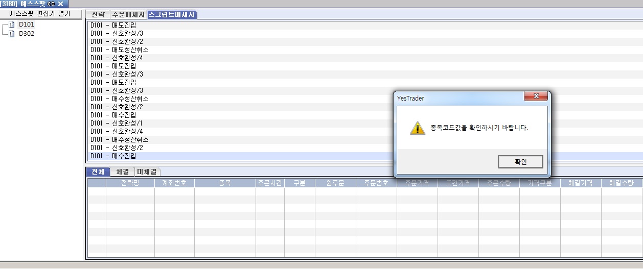 주문이 나가므로 종목코드값을 확인하라는 메세지가 발생합니다.