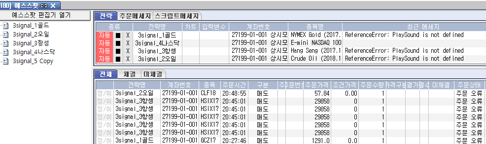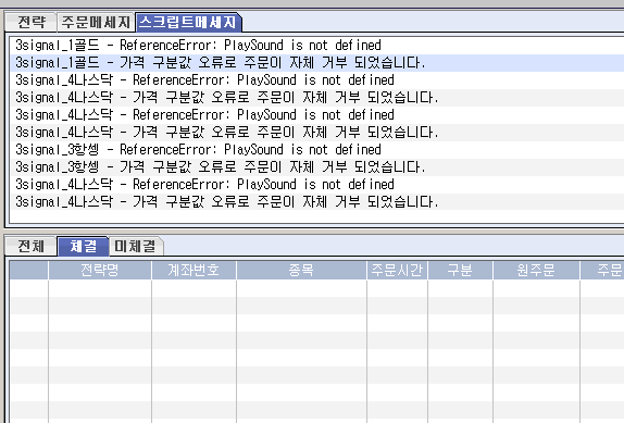 그리고 체결시 소리가 나도록 설정된 부분도 그림에서처럼 에러가 발생합니다.