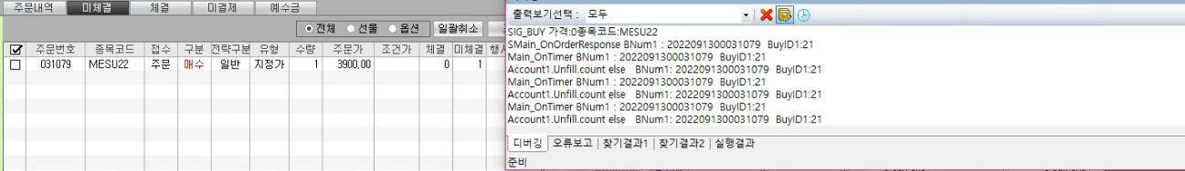 디버깅을 위해 스팟식에서 미체결 잔량이 발생하도록 지정가 주문하고, 타이머에서