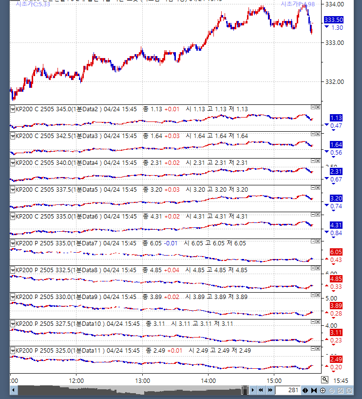 기본차트는 KP200연결선물이고 콜/풋 옵션을 참조데이터로 추가하는데