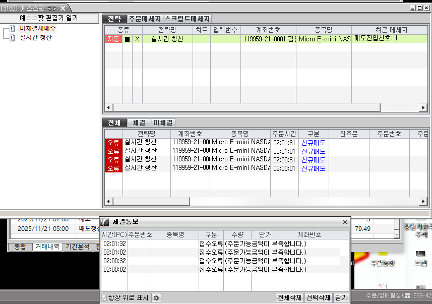 그런데 체결통보내역을 보면 설정한 10초가 아니라 거의 30초 단위로 재진입주문이 들어갓습니다.. 원인이 무엇인지요?