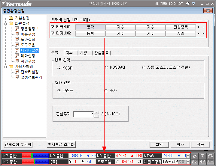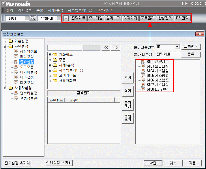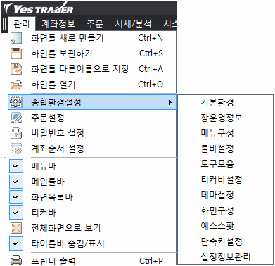 YesTrader 상단의 메인툴바에 나타나는 화면들을 지정할 수 있습니다.