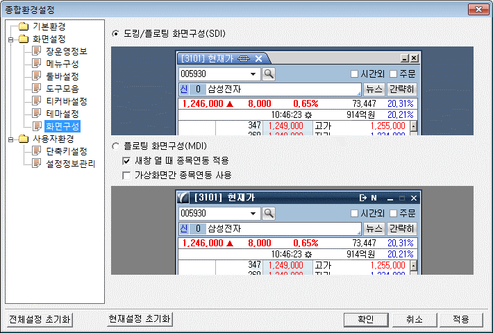 플로팅 화면구성(MDI) 방법은 일반HTS의 창처럼 플로팅 상태로 띄우는 화면 구성입니다.