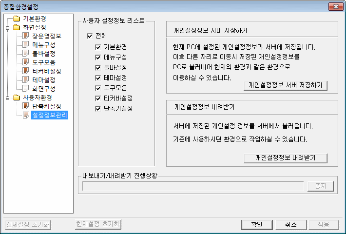 "전체설정초기화"를 클릭하면 종합환경설정의 전체 내용이 초기 설정 상태로 초기화 됩니다.