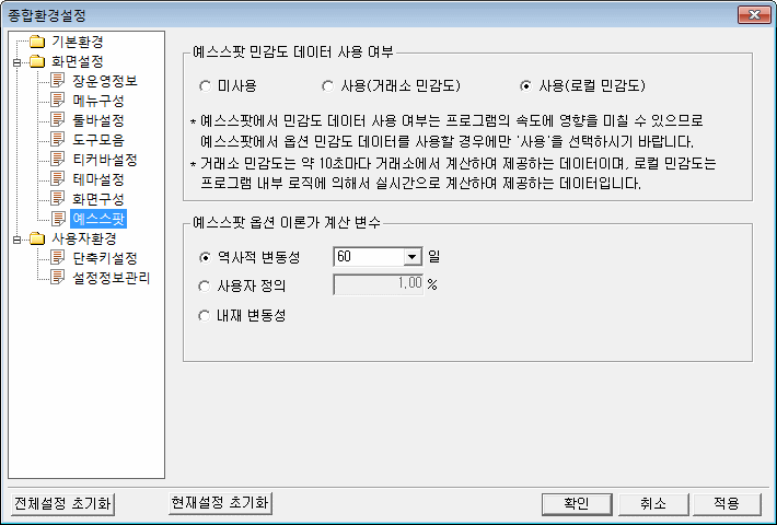 [6131]예스스팟, [6132]예스스팟 편집기, [6133]옵션포지션북 에서 사용할 민감도 및 옵션 이론가 계산 변수를 설정할 수 있습니다.