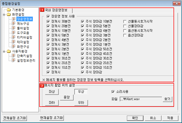 장운영정보 메시지창의 팝업 위치 및 소리 사용여부를 지정할 수 있습니다.