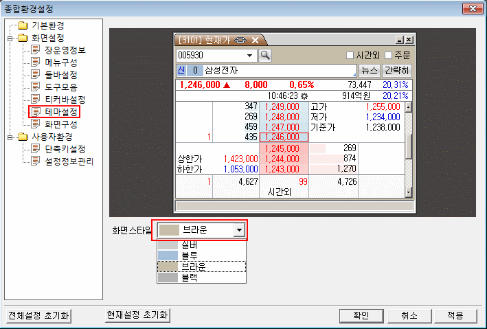 YesTrader의 화면 색상을 지정할 수 있습니다.