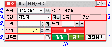 버튼을 클릭하면 지정한 주문조건에 의한 '매수, 정정, 취소' 주문이