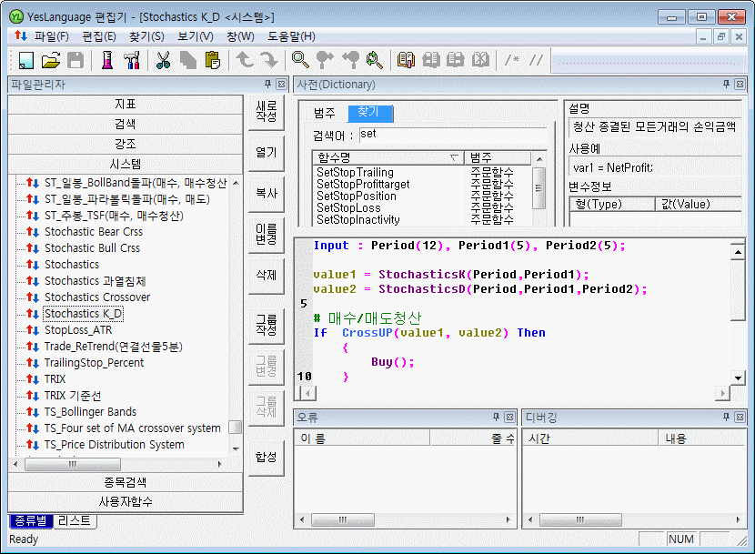 예스랭귀지는 사용자의 다양한 매매전략을 구현해주는 강력한 시스템 트레이딩 언어입니다.