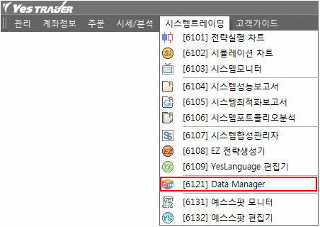 예스트레이더 메뉴 [시스템트레이딩 > [6120]Data Manager]를 클릭하면 Data Manager 화면이 실행됩니다.
