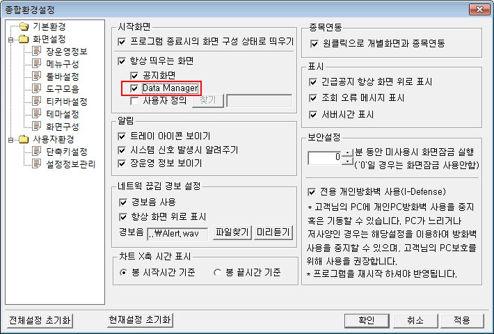 따라서 Data Manager를 사용하실 경우 환경설정의 '항상 띄우는 화면'에서 'Data Manager'를 체크하여 예스트레이더가