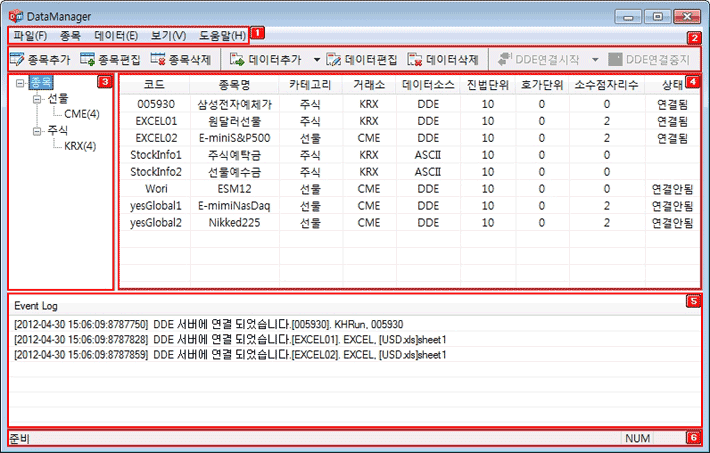 Data Manager는 '메뉴바, 도구모음, 종목구분영역, 종목조회부, Event Log, 상태표시줄'로 구성되어 있습니다.