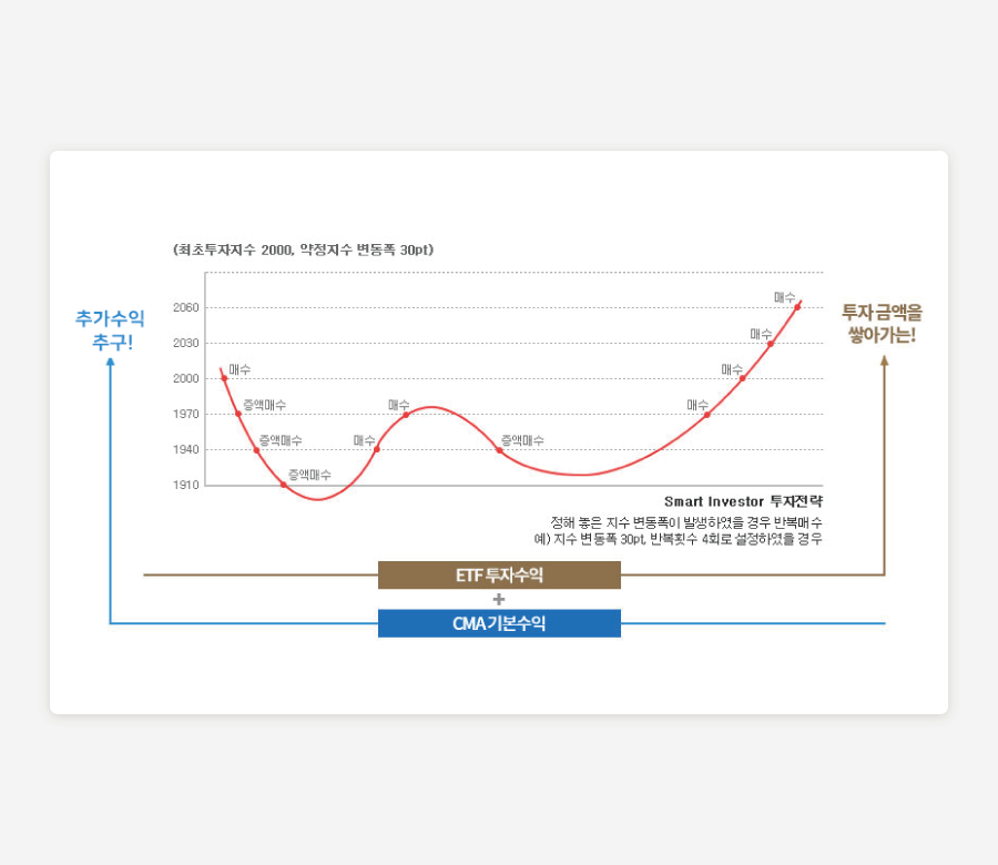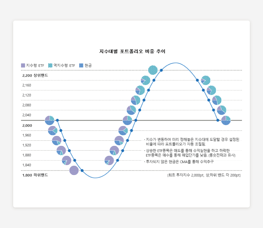 종합주가지수 변동폭을 기준으로 ETF를 자동으로 분할 매수하고, 목표 수익률에 도달하면 자동 매도까지 실행하는 정석적인 자동투자 서비스입니다.