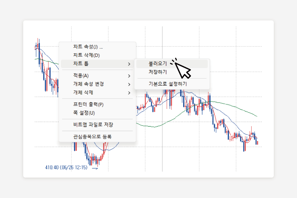 차트, 배경, 지표 등 모든 요소에 개별 설정으로 적용할 수 있으며, 여러 차트에 지표나 전략을 한 번에 적용하거나 삭제할 수 있어 원하는 분석 환경으로 효율적으로 구성할 수 있습니다.