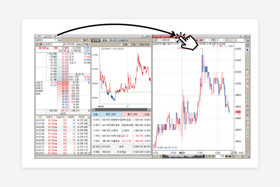 한 화면에서 종목을 변경하면 연동된 모든 차트와 데이터가 동기화되어 분석이 더 간편해집니다.