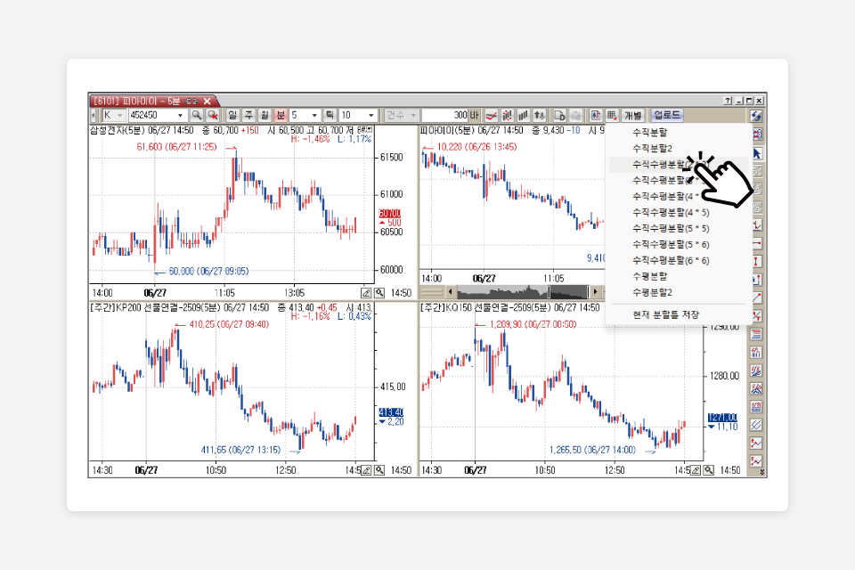 하나의 화면을 여러 차트로 나누어 다양한 종목이나 시간 주기를 동시에 비교 분석할 수 있어, 트레이딩 효율이 극대화됩니다.
