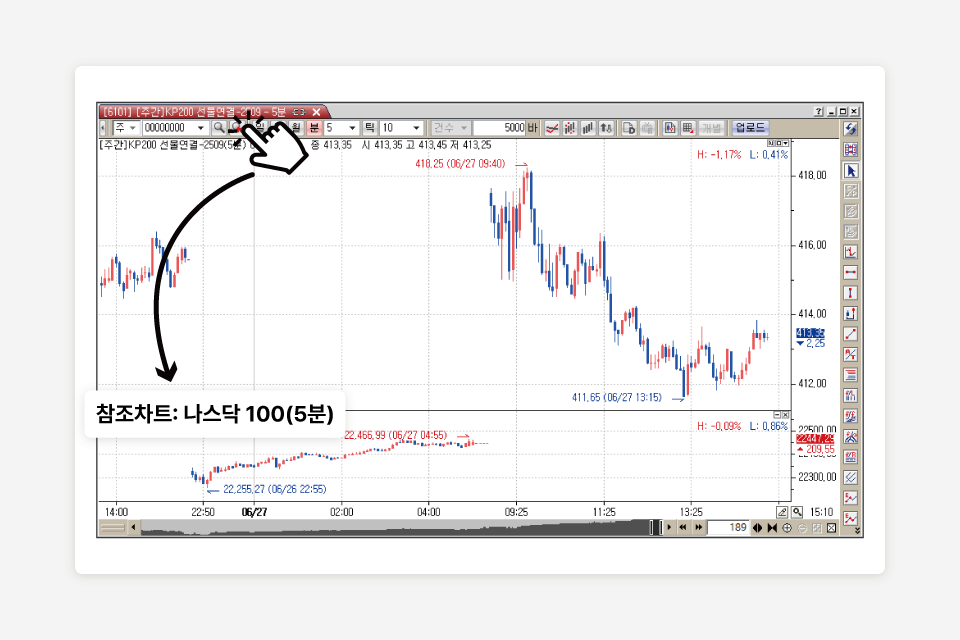 기본 차트에 다른 종목이나 시간 주기의 차트를 중첩시켜 기술적 지표처럼 활용 가능하며, 보다 입체적인 전략 수립이 가능합니다.