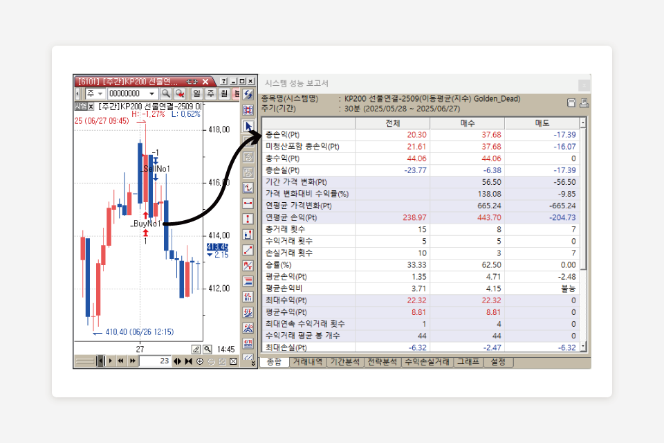 차트에 전략을 바로 적용해 실시간으로 매매 신호를 발생시키고, 자동 주문까지 이어집니다. 전략은 성과분석 리포트로 상세하 검증할 수 있어, 과거 데이터와 실거래 모두에서 전략의 유효성을 확인할 수 있습니다.